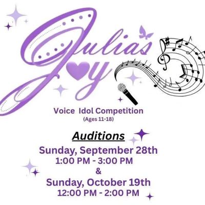 Thank you so much for your interest in auditioning for the 8th Julia's Joy Voice Idol Competition! Auditions are being held on September 28th from 1-3PM and Oct. 19th from 12-2PM! We are excited to meet you and hear you sing for our panel of judges, which will include previous winners and former contestants.